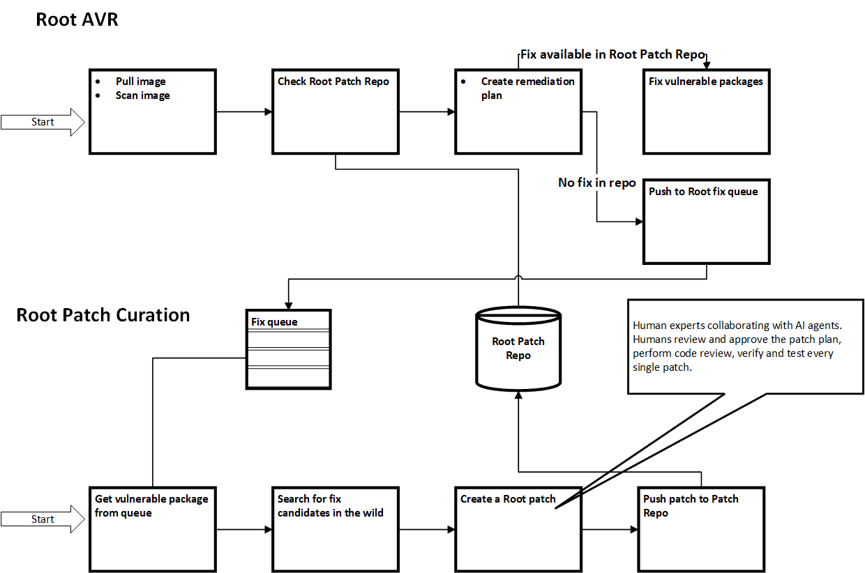The Root platform operates as a continuous vulnerability management cycle, constantly monitoring for new security issues and remediating packages as soon as threats are identified. This ongoing process employs two main components that work in tandem: AVR and Root Patch Curation. Root's approach combines agentic AI with human expertise to ensure safe, production-ready results. A description of each process appears below followed by a high-level flow diagram that shows their interaction and the continuous nature of the vulnerability management cycle.