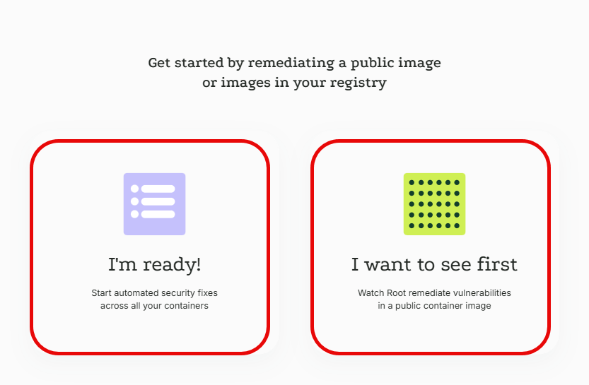 Now choose I'm ready if you want to go ahead, integrate your image registry with Root and start remediating your private container images, or I want to see first if you'd first like to give it a test run with a public container image.