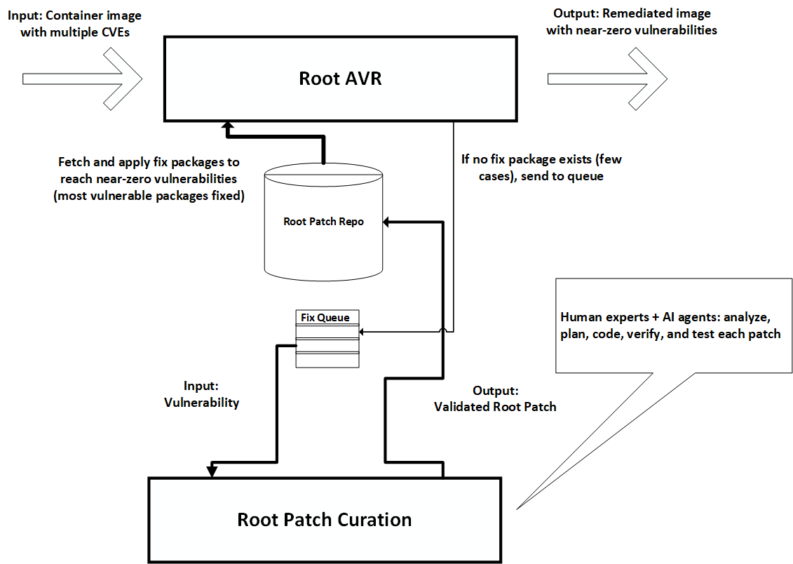 - AVR - During the Agentic Vulnerability Remediation process, Root scans your image, applies patches from its repo, and rebuilds the image with near-zero vulnerabilities. Packages for which no patch was available go into the queue for the Root Patch Curation Process, and when they become available are added to the fix repo. New patches will be applied during the next image scan.