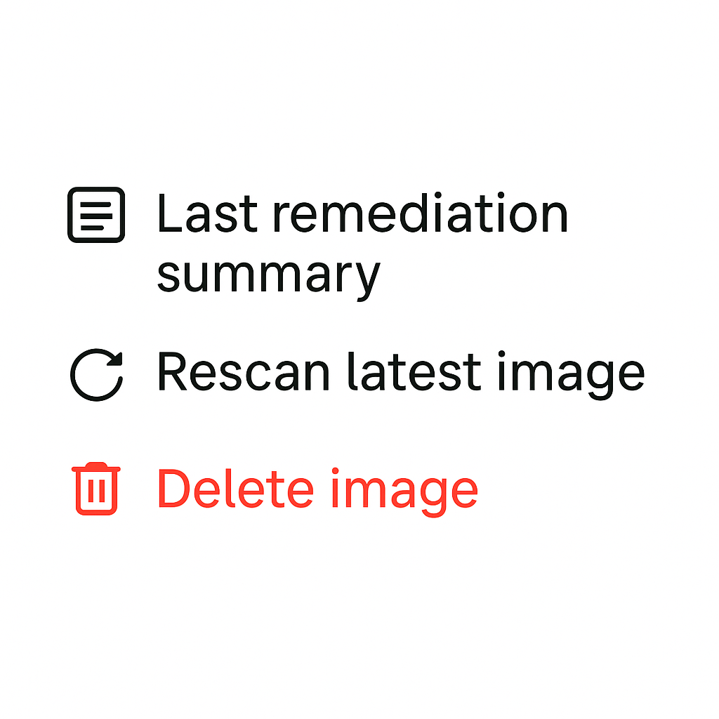 From the ... menu at the far right, you can: go to a summary of the last remediation, rescan the latest image, or delete the image.