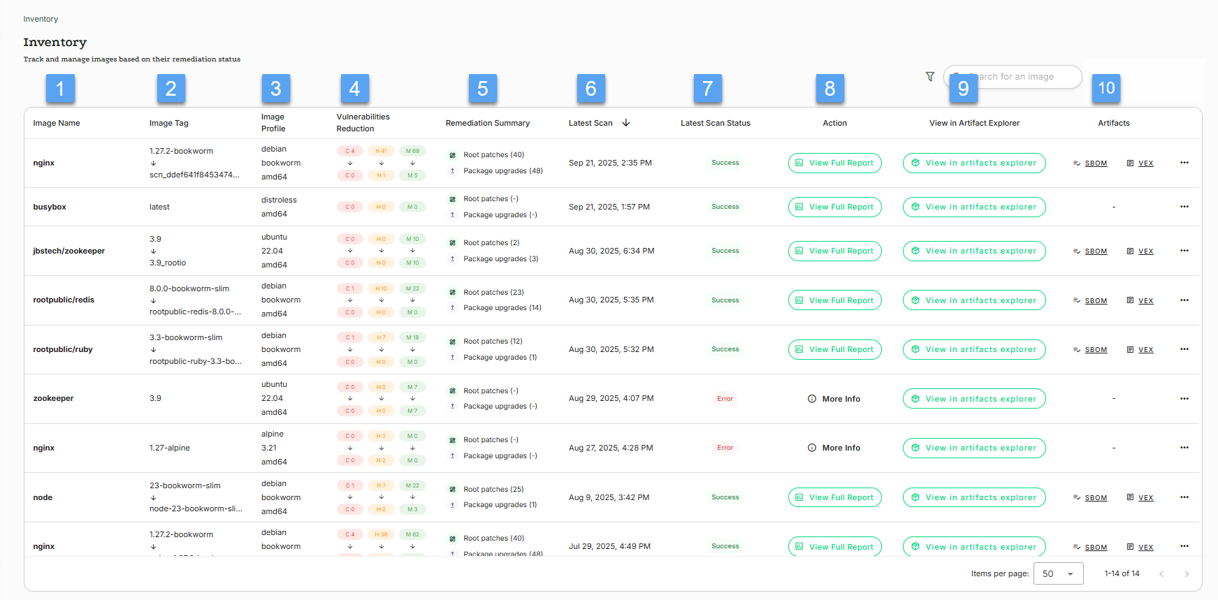 On the Inventory page you can view security posture for each remediated image, highlighting vulnerability reduction and types of fixes applied.